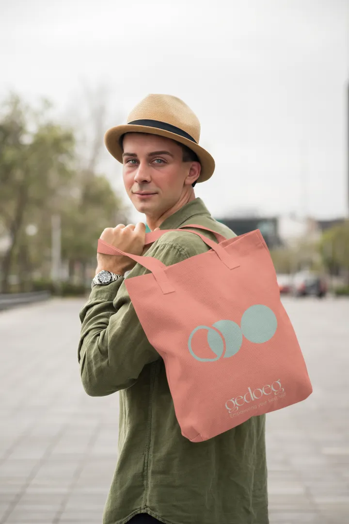 Tote bag design for Gedoeg — part of the brand’s visual identity and merchandising concept..Infographic design for Gedoeg — a visual guide illustrating the coaching process through a clear, human-centered approach.